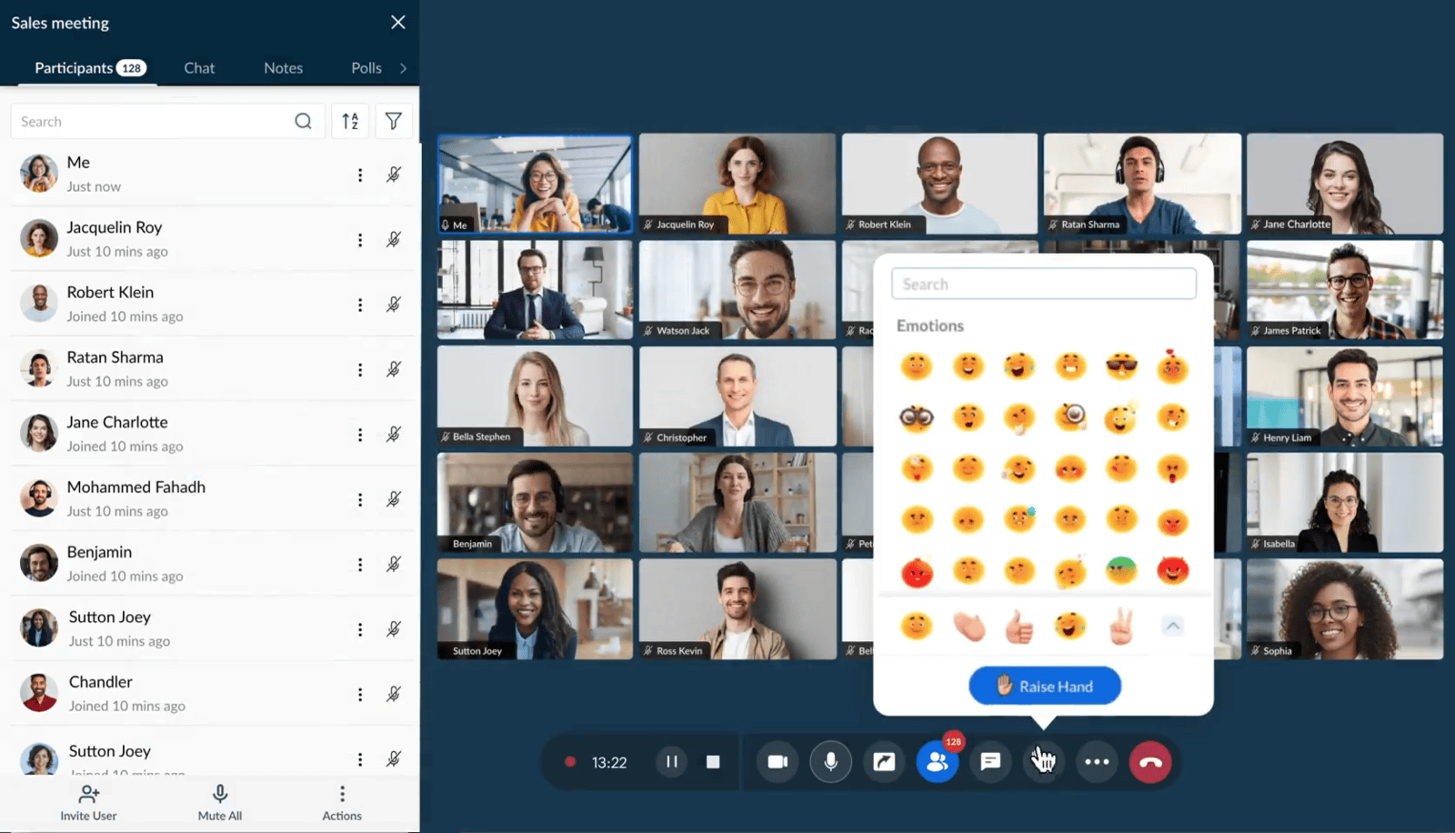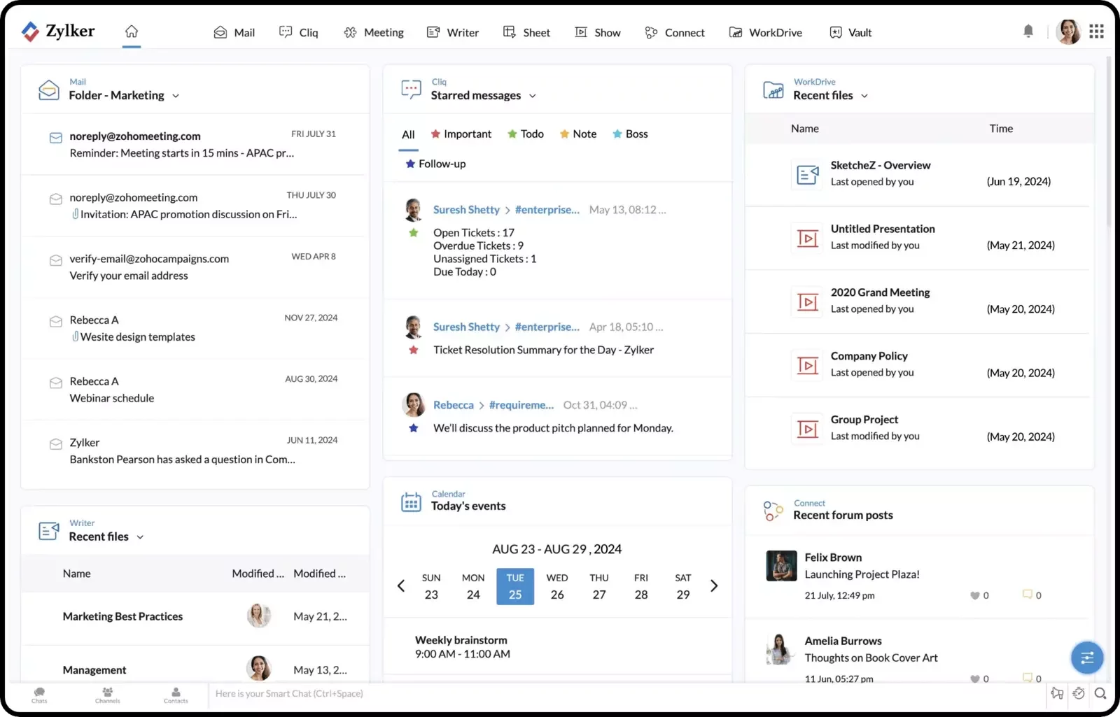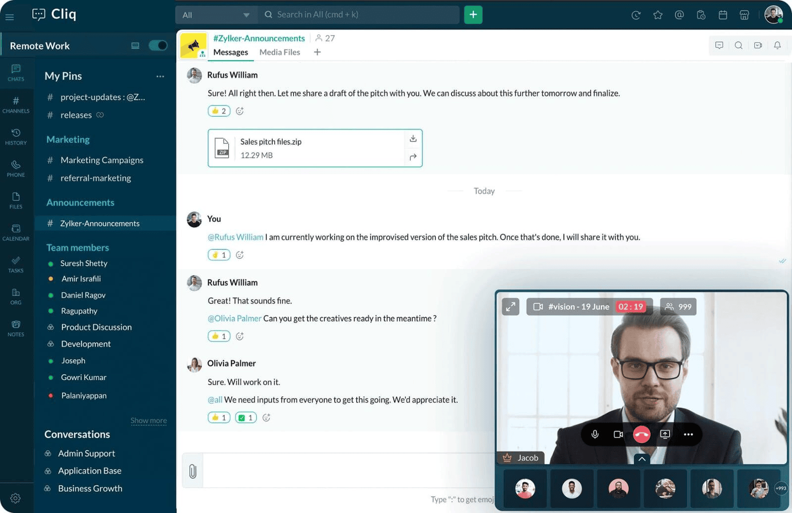 O Zoho Cliq facilita conversas comerciais entre equipes internas ou partes interessadas externas, oferecendo videoconferência e canais personalizáveis para trabalho híbrido.