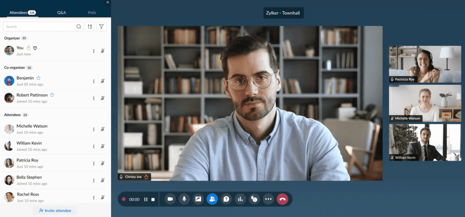 O Zoho Meeting é uma plataforma segura para reuniões online e webinars, com recursos de gravação, compartilhamento de tela, interação com o público e integração com outras soluções.