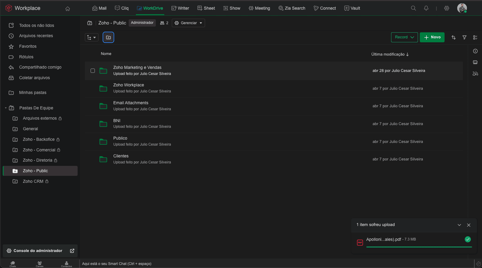 O Zoho WorkDrive é uma plataforma unificada para armazenar, compartilhar e colaborar em documentos em tempo real, com pastas de equipe, editores integrados e suporte a dispositivos móveis.
