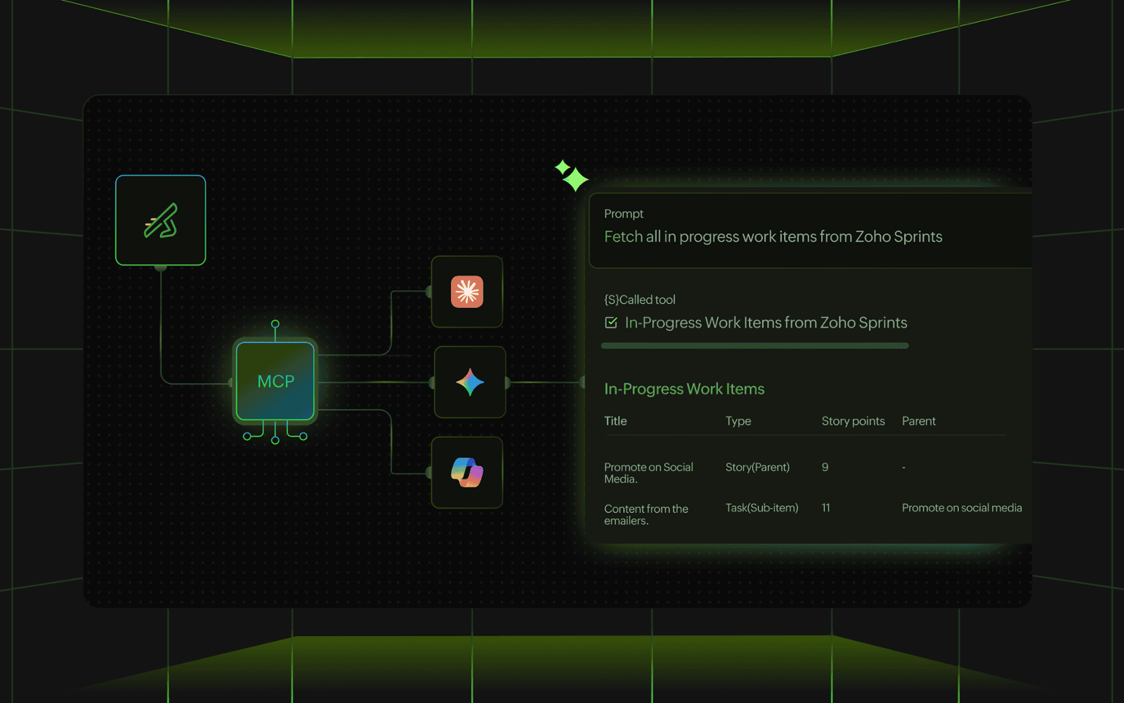 Habilite a interação segura com LLMs por meio do Zoho MCP para executar ações desejadas usando modelos de IA. Saiba mais