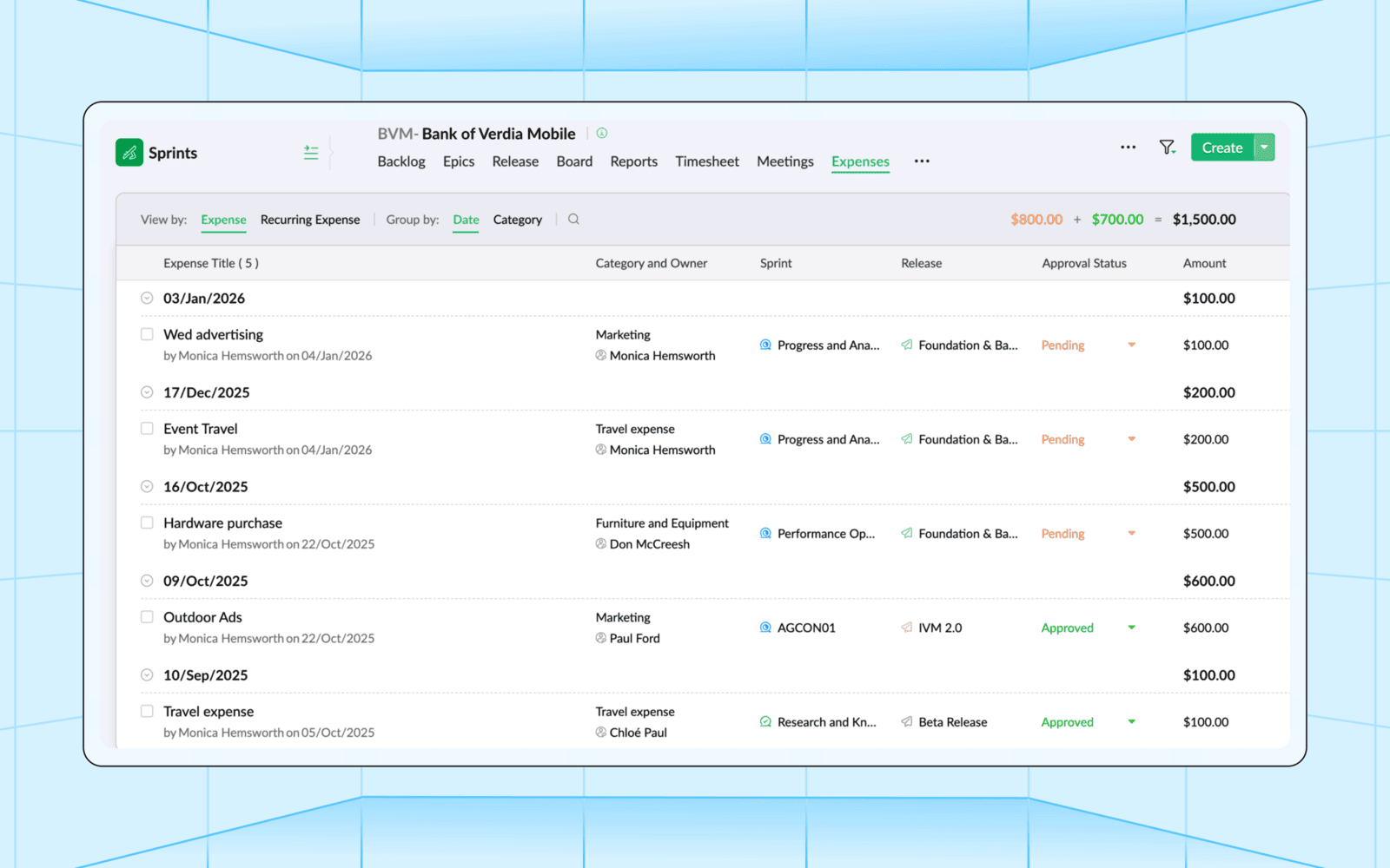 Controle os gastos do seu projeto registrando e monitorando suas despesas. Categorize as despesas para manter a contabilidade em dia. Siga o mecanismo de aprovação integrado para usar os recursos financeiros disponíveis de forma criteriosa.