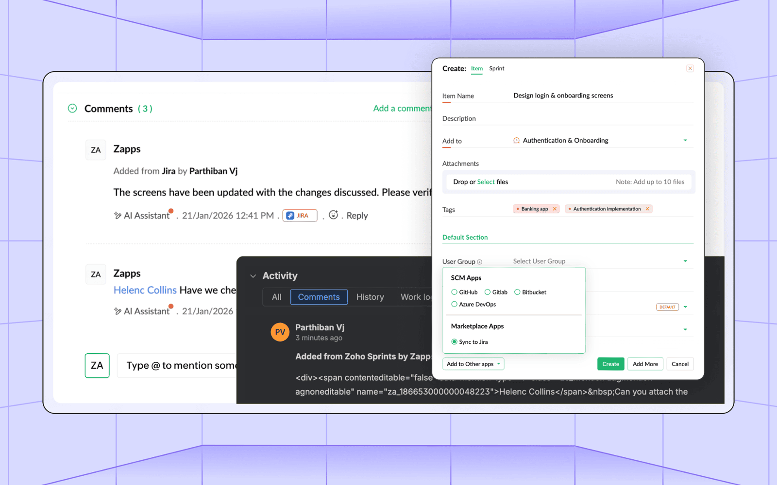 - Integração com o JIRA: Simplifique o gerenciamento de tarefas e problemas entre os aplicativos JIRA e Zoho Sprints.