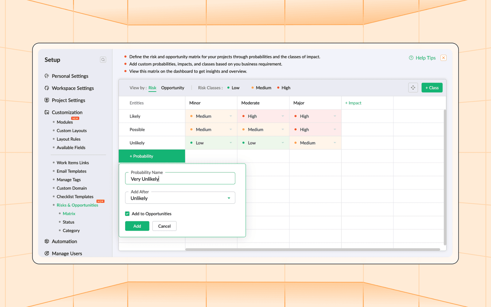 A gestão de riscos e oportunidades baseia-se em sistemas de quantificação bem estabelecidos, denominados matrizes de risco e oportunidade. Isso permite a fácil classificação do nível de risco ou oportunidade e do impacto resultante. É possível avaliar a viabilidade de uma oportunidade ou a eliminação de um risco por meio de uma série de etapas.