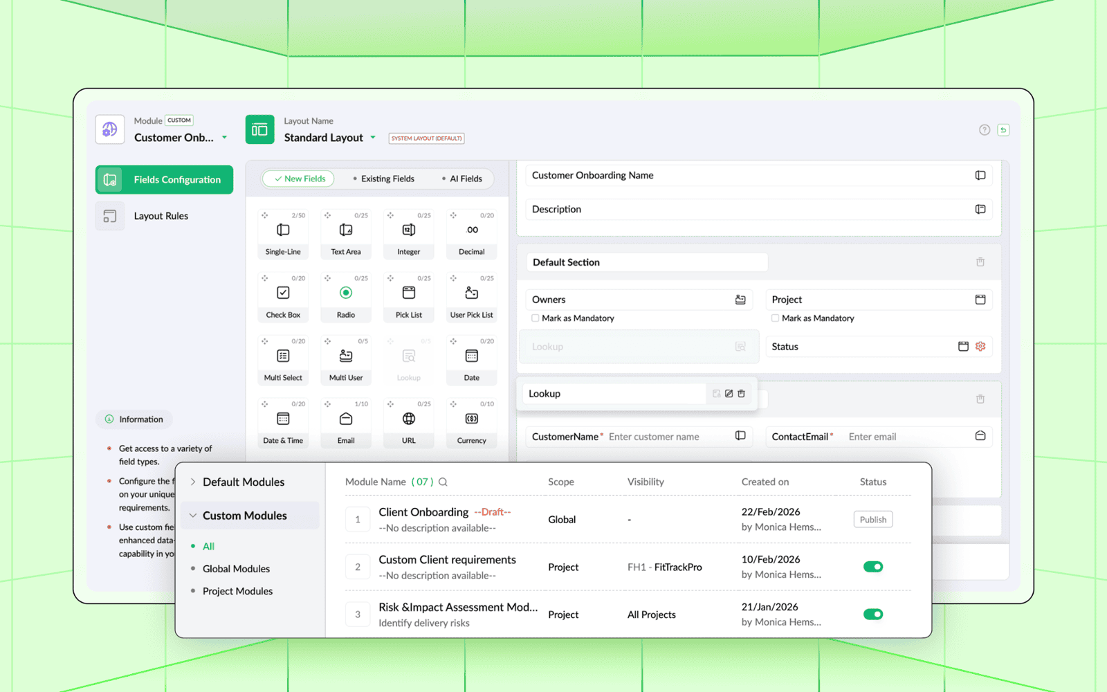 Crie seus próprios módulos globais e de projeto para personalizá-los de acordo com as necessidades específicas do seu negócio. Isso transforma completamente a maneira como você coleta e processa dados da sua organização, ampliando os limites da personalização. Saiba mais
